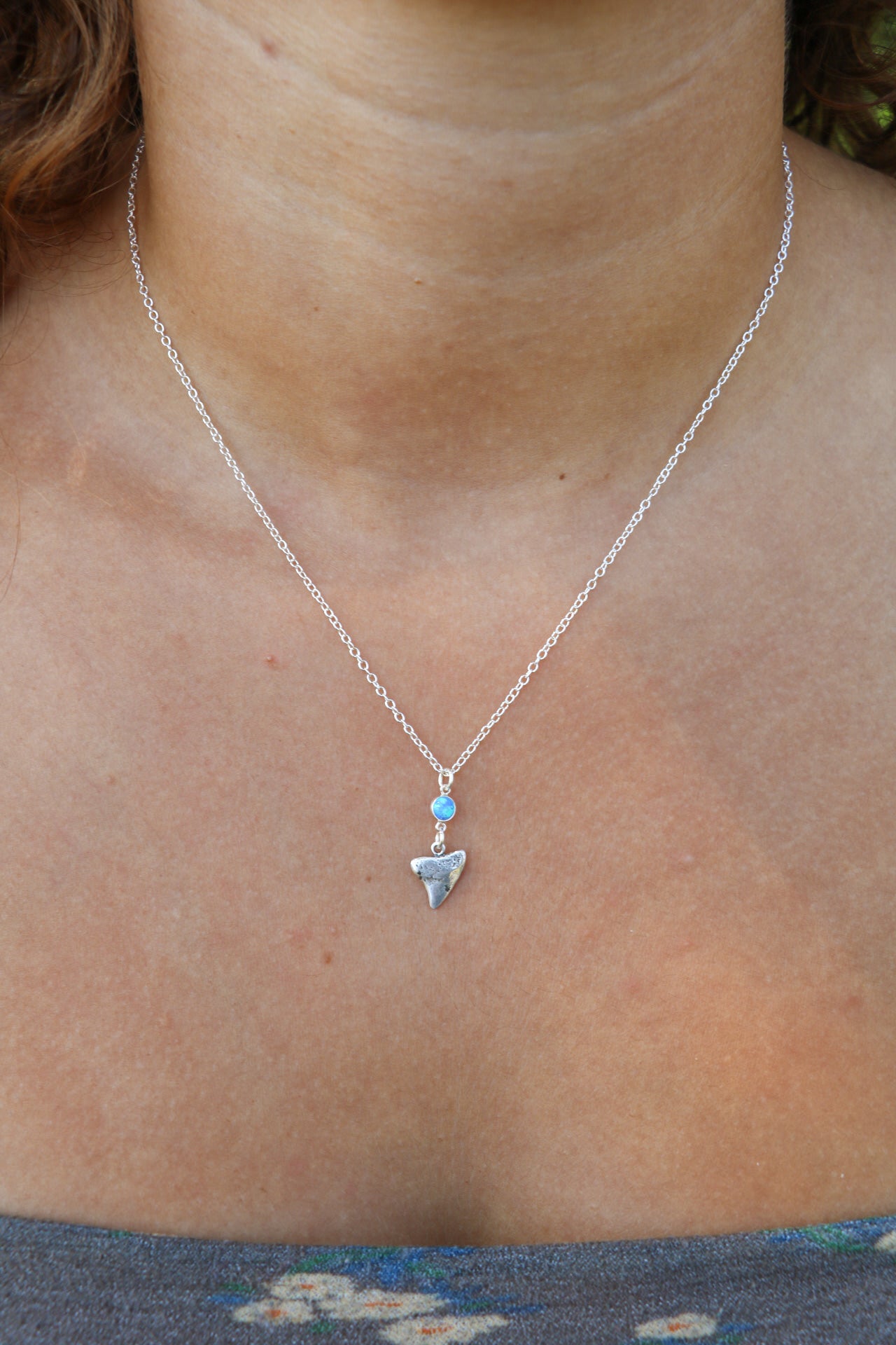 16 inch stainless steel chain, sterling silver shark tooth charm, and a blue opal accent