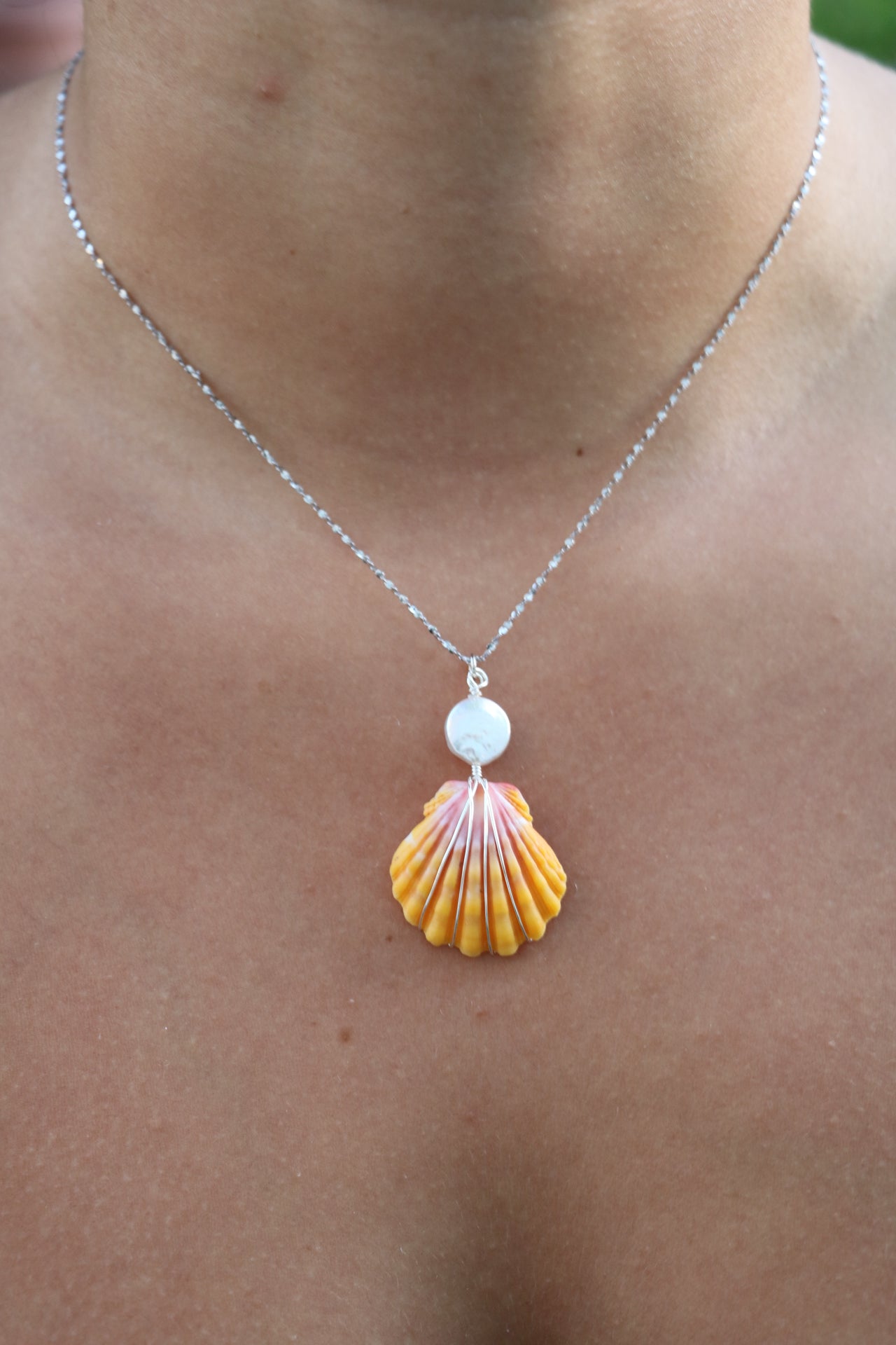 Stainless steel 16 inch chain, a vibrant sunrise shell, and a baroque pearl
